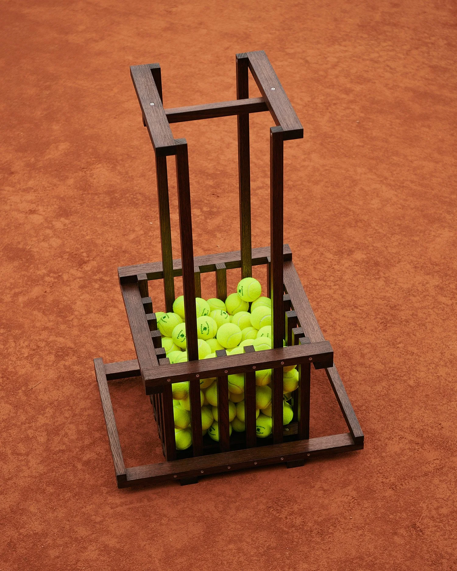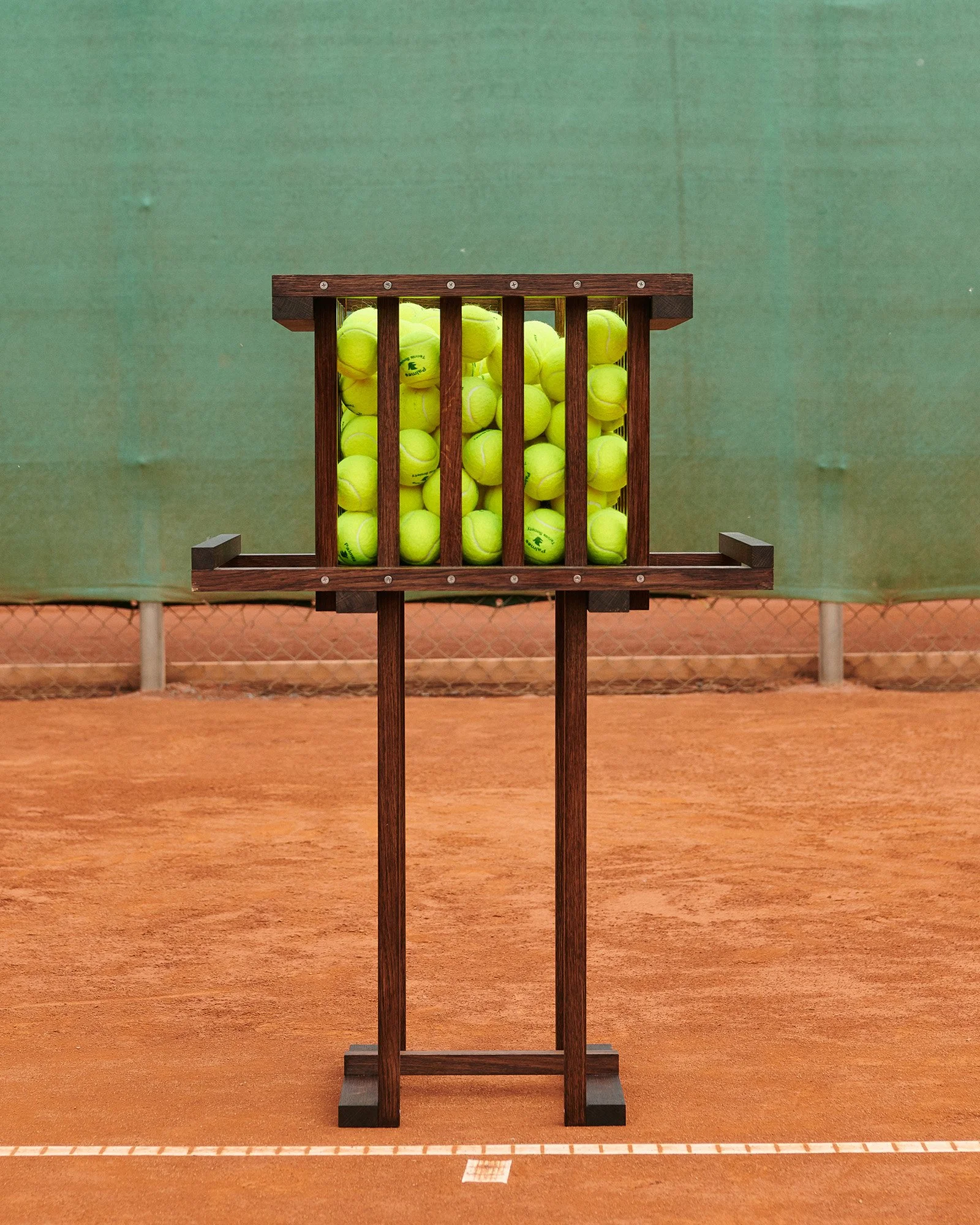As an accolade the tennis ball basket, we asked close friends of the Palmes Tennis Society, Copenhagen-based design-duo Frederik Gustav to approach its typology as that which is is β an architectural hallmark. From that came Trophy. With their abstraction being made by hand in stained oak and designed to have the basket in either top or bottom, the structure of Trophy fuses together that of its original shape with the sentiment of a trophy; serving as an practical yet informal testimony to the archetypal ball basket.